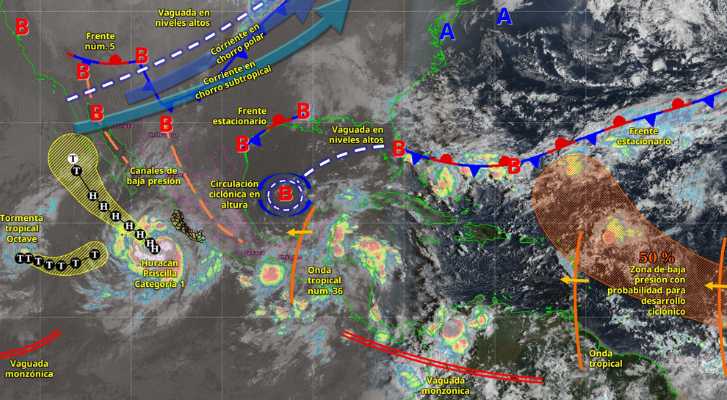 La amplia circulación de Priscilla genera lluvias intensas (75 a 150 mm) en Colima, sur de Jalisco y costa de Michoacán, así como precipitaciones muy fuertes en Nayarit y fuertes en Baja California Sur. Las lluvias, acompañadas de descargas eléctricas, podrían provocar encharcamientos, deslaves e inundaciones en zonas vulnerables. Asimismo, se esperan vientos de hasta 90 km/h en costas de Jalisco y Colima y olas de hasta 6 metros de altura.