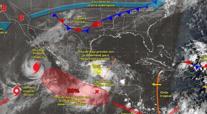 México.- El huracán Priscilla se degradó a tormenta tropical mientras avanza paralelo a las costas de Baja California Sur, según el reporte más reciente de la Comisión Nacional del Agua (Conagua). A mediodía del miércoles, el sistema se ubicaba a 315 kilómetros al sur de Cabo San Lucas, con vientos sostenidos de 110 kilómetros por hora y desplazamiento hacia el noroeste.