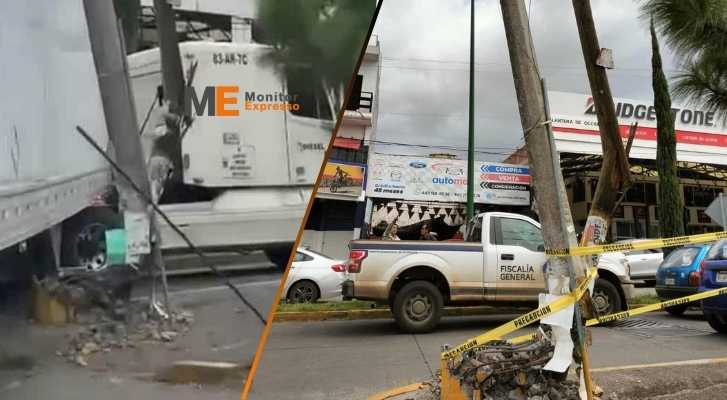 Morelia.- Un chofer de tráiler, al realizar maniobras para incorporarse de la calle Ignacio Aldama a la Avenida Periodismo, en Morelia, destrozó dos postes, uno de la Comisión Federal de Electricidad (CFE) y el otro de Telmex, además dañó la fachada de un negocio de ropa, trascendió en la cobertura de la noticia.